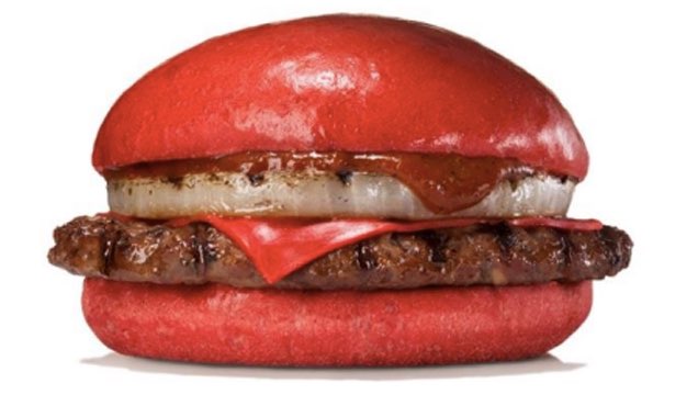 What you’re peeping at here is a Samurai (Red) Burger from Burger King Japan. It features (as you can see) blood red cheese and buns, and red ANGRY sauce. Yum?